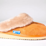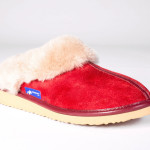 Mule en suède avec collet de mouton et semelle de caoutchouc souple. Élévation au talon d’environ 20mm.